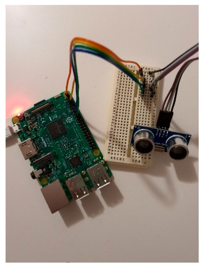 For our smart water monitoring system case scenario, the water level in each tank is measured periodically based on the water depth reading of the sensor, and its rate of outflow determines the valve opening rate. The pressure of the mains is likely to vary, and the rate of filling versus the rate of outflow determines the valve is opening duration. The controller makes the decision of how long the valve should be kept open based upon the rate of refilling. The tank sensing and filling are on one sub-system, and the decision control is separate. These sub-systems are on different networks. The decision control and monitoring are performed using a mobile app. A secure connection using our proposed security model is established among the IoT devices, such as the tank sensor, tank valve, and the controller. Figure 7 shows a prototype of Raspberry Pi and the water sensor connected with a breadboard for our pilot implementation and testing.