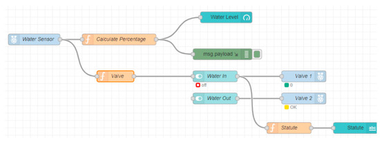 A process flow diagram for the operation of water sensors and valves is given in Figure 8. The “Calculate Percentage” node calculates the percentage of water level based on the data from the water sensor, and the result is transferred to the “Water Level” dashboard node to display the output on the mobile app dashboard for the monitor and control of water level remotely. An illustration of the output is shown in the dashboard is given in Figure 9. To perform an auto refill of water with “Valve l”, a rule is set, such as “if the water level is less than 15% of tank capacity, turn ON the valve; if the water level is greater than 80%, turn OFF the valve”. Valve 1 is then connected to a valve switch control “Water In” node that triggers the action accordingly with the status, “Statute” which is set to communicate “Water is refilling” if Valve 1 is ON, or “Water is ready to use” if Valve 1 is OFF.