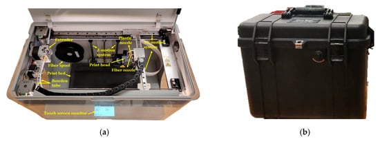 The materials (plastic and fiber filaments) for the research came with the Mark Two composite printer. Their mechanical properties are mentioned in Table 1. The fiber filament spool is placed on the holder attached inside the printer, while the plastic filament spool is always kept in a separate dry box to prevent moisture absorption from the surrounding environment (Figure 1b) and placed right next to the printer.