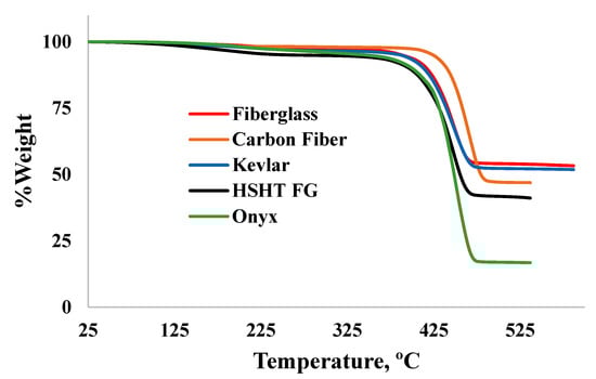 The nature of TGA data (Figure 2) demonstrates that the plastic material for all composite filaments is same and belongs to Nylon, of the sixth category, as the thermal degradation temperature was recoded at 472 °C [20]. Using the spectra for different composite filaments in Figure 2, the fiber: plastic compositions (by weight) are tabulated in Table 2. The fiber volume fractions of the composite filaments and fiber densities were also calculated using Equations (3) and (4), respectively. The calculated densities of the fibers are plausible, since their properties are within the range of the engineering grade [21,22,23]. Moreover, it appears that the chopped carbon fiber in the Onyx plastic filament is different than that in the carbon fiber composite filament, having different densities. The measured information (especially fiber volume fractions and fiber densities) is crucial for the users of the printer to estimate and manipulate the mechanical properties of the fabricated composite for specific end use applications.