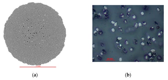 Figure 4 exhibits different cross-sectional views of fiber filaments at different magnifications demonstrating a general finding that fibers (dots) and polymer are not uniformly distributed, forming fiber and polymer rich regions. The few dark spots as observed in the figure might be formed due to either poor interface or cracking during sample preparations. Image analysis with ImageJ was performed to measure the fiber and filament diameters (Figure 4a,b) and count the number of dots (representing filament tows) as shown in Figure 4d, and the results have been reported in Table 2. As seen from the cross-sectional images in Figure 4, the diameters of the fibers and the filaments are uneven, therefore, measurements were taken from different directions within the same cross-section as well as from different cross-sections (several cross-sections were prepared for different fiber filaments). For counting the number of fibers, both ImageJ counting system and manual counting was performed. The values in Table 2 were obtained by applying cell counting procedure in ImageJ. The number of fibers can also be calculated using Equation (5) which bolsters the approximation of the measured values. The carbon filament has the highest number of fibers (≈1000) in the cross-section and largest diameter with smallest diameter of the constituting fiber, while the Kevlar filament has the lowest number of fibers (≈270) and smallest cross-section with highest diameter of the constituting fiber.