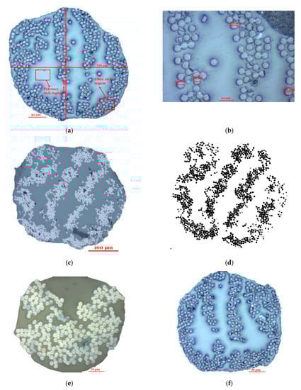 Cross-sectional views of fiber filaments (for fiber supply); fiberglass at 200× (a), fiberglass 500× (b), carbon fiber at 100× (c), carbon fiber filament tows shown as dots applying cell counting procedure using ImageJ (d), Kevlar at 200× (e) and high strength high temperature fiberglass (HSHT) FG at 200× (f).
