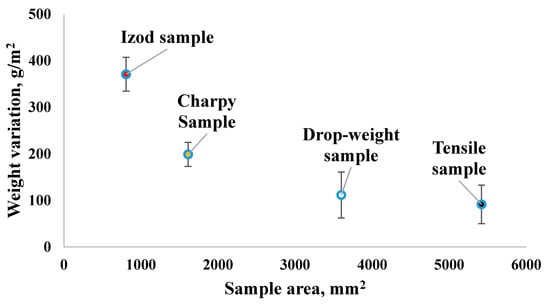Print accuracy includes precision in the dimension and weight of the printed parts relative to the dimension set in the computer-aided design (CAD) system and expected weight estimated by the slicer based on the materials used. For dimensional accuracy, the length, width and thickness were measured for the samples prepared for the evaluation of mechanical properties of 3D printed fiber-reinforced cellular composites used in our previous research [8,9] with 0.1 mm thickness, and found negligible variation from the expected dimensions, within a tolerance limit defined by the manufacturer: one tenth of a layer (0.01 mm). However, in the case of weight, the measured weights after printing of the parts were found to be less than the estimated weight by the Eiger slicer. Figure 5 illustrates the differences between measured and estimated weights for different sizes of sample with 3 mm thickness (tensile specimen: 152 mm × 35.54 mm; Drop weigh (Tub) impact specimen: 60 mm × 60 mm; Charpy impact specimen: 127 mm × 12.7 mm; and Izod specimen: 65.5 mm × 12.7 mm), which illustrates the weight difference is higher for smaller samples. Usually, underweighting might happen for several reasons such as under-extrusion (supporting attachment, page 18) due to lack of uniformity of the supply materials, improper gripping by the driving rollers or underfeeding by the nozzle [8]. In addition, requirements of relatively more frequent movements for smaller samples might exert higher stress on the nozzle that may eventually affect the amount of material extruded and therefore, it might be responsible for printing with relatively less material.