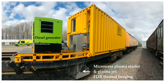 The microwave system consists of a 15 kW, 2.45 GHz magnetron-based microwave generator (Muegge, Germany, www.muegge.com) with variable power output, an isolator (circulator + water load), an E/H manual impedance tuner, a manual sliding short circuit, and a TE01 monomode microwave resonant cavity/plasma reactor; the reflected power was measured via a diode detector mounted on the isolator’s water load. The microwave generator consists of a high-voltage (HV) switch mode DC power supply with low ripple and a separate magnetron head; the HV power supply and the magnetron are interconnected via two cables: an HV cable for the electrical power transmission to the magnetron and a low voltage cable for data transmission and collection. The values of forward and reflected power are monitored continuously and controlled via a remote HMI/PLC. To prevent any accidental gas release inside the waveguides, microwave transparent windows (PTFE/quartz) were inserted upstream of the plasma reactor; fibre-optic arc detectors were also installed in the vicinity of the E/H tuner. The role of the arc detectors is to shut down the microwaves if arcing inside the waveguides detected. Due to the geometry of the system and the use of PTFE windows (light barrier), the arc detectors were not activated at the ignition of or during the operation of the plasma. Handheld microwave leakage detectors were used to measure the microwave leakage around the system and to make sure that the level of the microwave leakage was below 5 mW/cm2 at 5 cm from the system when the microwaves were on. Once the plasma was ignited and depending on the microwave forward power, the microwave leakage around the remote plasma zone was sometimes measured to be higher than 5 mW/cm2. To ensure the safe operation of the equipment and to avoid interference with the electronic circuits of auxiliary equipment, Faraday cages made of metal mesh to enclose the plasma zone and safety barriers for the operators were installed. To simulate the real distance between the railhead and the place where the microwave generator was installed in the real mobile testing condition (train wagon), a vertical rigid waveguide structure was designed and built between the E/H tuner and the plasma reactor. All testing—laboratory and real conditions mobile on-track—were performed using this set-up (Figure 1 and Figure 2); supplementary files (Videos S1–S3) of the laboratory and mobile on-track real condition can be accessed in the on-line version of the paper.