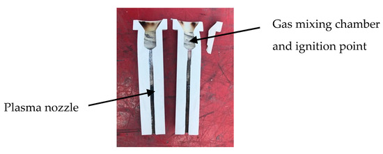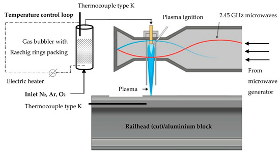 The microwave plasma was ignited and sustained within a dielectric tube placed in the center of the TE01 monomode microwave cavity. Plasma was ignited via a tungsten (W) rod operated with an actuator; the W rod was inserted briefly into the microwave field at each microwave ON signal. The atmospheric plasma sustained in different gases (nitrogen, argon), as well as mixtures of these gases with reactive molecules (water vapor, oxygen), was jetted directly onto the railhead as to change the conditions for the wheel–rail interface (Figure 3). It should be noted that to lower the emission of toxic by-products type NOX formed by plasma in air at atmospheric pressure, nitrogen and argon were the gases used in both the laboratory and real mobile conditions testing. While argon was supplied from a cylinder, nitrogen was produced with a custom-built nitrogen generator having the possibility to adjust the O2 concentration from 0% to 20%. The economics of compressed air vs. nitrogen and the resulted pollutants will be assessed in a different study.