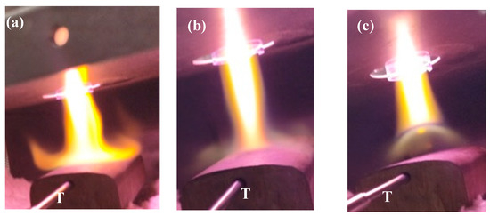Plasma optimization vs. nitrogen flow rate and diameter of the dielectric tube; (a) 5 L/min; (b) 10 L/min; (c) 15 L/min. Pforward = 2 kW, ϕint = 20 mm, T = thermocouple.