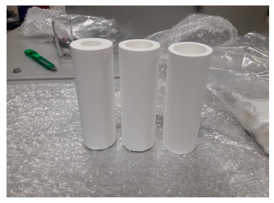 A brief investigation into AlN showed that solid rods of AlN were difficult to bore (using in-house CNC milling and diamond-tipped tools) and had a catastrophic failure on the first plasma test—the tube snapped in two parts at the end of 10 s plasma testing (Figure 5); this material was discounted from further development.