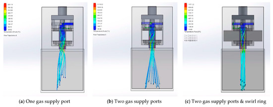To help the creation of a stable plasma that can absorb as much energy as possible while keeping the total gas flow as low as possible, an important part of the development of the plasma reactor consisted of understanding the flow dynamics and of achieving a vortex gas flow into the plasma reactor. Computational Fluid Dynamic (CFD) analysis of the gas entrainment was completed to confirm vortex creation. This included evaluation of the number of gas supply ports and pre-conditioning ‘swirl’ rings. These were then practically evaluated in the static testing section; a two-port solution with a swirl ring was adopted (Figure 7c).