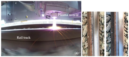 Photographs taken with a Go-Pro camera during on-track testing. (a) plasma ON; (b) and (c) rail track showing the cleaning effect of plasma (removal of rust and other debris).