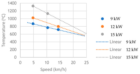 The data logged from the FLIR thermal analysis has been used to estimate the effect of microwave power vs. DMU speed. Every test configuration has been analysed for peak temperature, width and length of the plasma thermal area of influence for any given power input and speed. The results presented in Figure 11 correspond to on-track tests using the BN tube with an internal diameter of 3 mm. The peak temperature on the rail surface was represented vs. the DMU speed for the three speed values (5, 10 and 15 km/h) and then, assuming a linear relationship between the speed, power and temperature, they were extrapolated to higher train speeds. The peak temperature effect is believed to be the most relevant parameter for predictable and optimised braking of passenger trains, this being indicative of the energy which would be delivered onto the third body layer. Figure 11 shows that at lower train speed the peak temperature increases with the microwave power while at higher speeds this temperature is less dependent on the power. Test results also indicated that the peak temperature depends on the internal diameter of the BN plasma tube (temperature increases with the decrease of the diameter), and on the total gas flow (temperature increases with the decrease of the total gas flow).