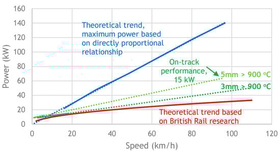 The results obtained from mobile real test conditions were overlaid onto the original power vs. speed graph as reported by British Rails research work using DC plasmas [23] (Figure 12), which was then used to estimate the microwave power required for higher speeds.