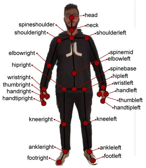 The approach we follow for human activity recognition has been presented in our previous work [26]. It is based on 3D skeletal motion information, resulting from video captured by an RGB and depth camera, namely the Microsoft Kinect v2 (https://developer.microsoft.com/en-us/windows/kinect). A set of 25 skeletal joints is extracted by the Kinect SDK and tracked in the 3D space and in real-time, while an actor performs a given activity. Interactions between actors are also being captured using a single camera, since Kinect supports simultaneous extraction of up to 6 skeletons. For each joint, its x, y and z coordinates are recorded. An example of an extracted skeleton is illustrated in Figure 1. Note that joints follow a graph-based representation; nodes correspond to joints, while edges connect neighboring joints.