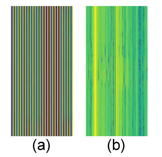 (a) A signal image that has been created by an example of the action “reading”; (b) the activity image of the signal image of (a), upon applying Discrete Sine Transform (DST). Figure best viewed in color.
