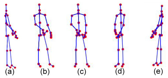 A raw skeleton that has been transformed using a simple rotation transformation by an angle : (a) , (b) , (c) (raw skeleton), (d) , (e) . Note that for illustrative purposes, z-coordinate that corresponds to depth information has been discarded.
