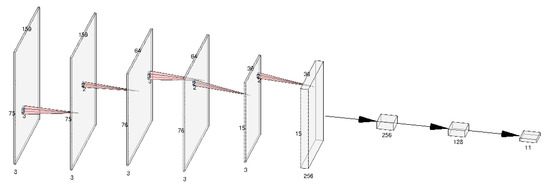 In this section we present the deployed CNN architecture used throughout the experimental section of this work (Figure 4). In brief, three convolutional layers are used to obtain high-level features, followed by two fully connected layers performing the classification. Max-pooling layers are used to sub-sample each convolution result. To help improve the generalization capabilities of our model, in this work we follow a popular approach and apply the dropout regularization technique [45], in which at each training stage several nodes are “dropped out” of the network. This helps to avoid complex co-adaptations between neurons which lead to overfitting. In addition, we use a validation set to monitor the validation loss and we utilize the early stopping technique. In more detail, the first convolutional layer filters the 159 × 75 input activity image with 32 kernels of size 3 × 3, the second convolution uses 64 kernels of size 3 × 3 over the input 76 × 34 image and the third convolutional layer filters the 36 × 15 resulting image with 128 kernels of size 3 × 3. At each stage, 2 × 2 “max-pooling” is applied. The aforementioned architecture has been selected through validation set tuning based on two factors: (a) the need to build sufficiently rich representations to allow for effective classification; and (b) the restriction of the number of parameters so as to allow flexibility, for example, for easy deployment of the model in low-cost platforms or mobile devices to perform inference on the edge, in real-life applications of the herein proposed approaches.