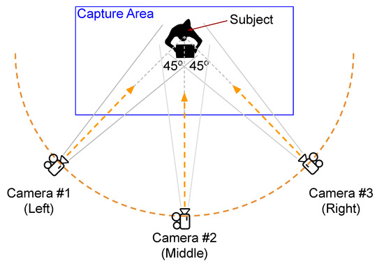 The camera setup that has been used for the creation of the PKU-MMD dataset. Cameras , , correspond to L, M, R, respectively (see Section 3.1).