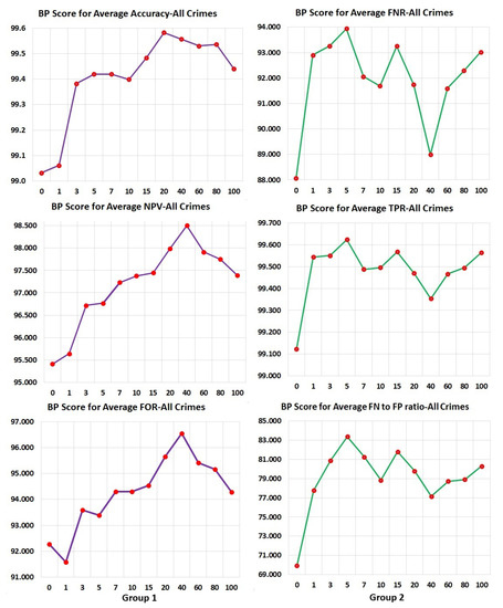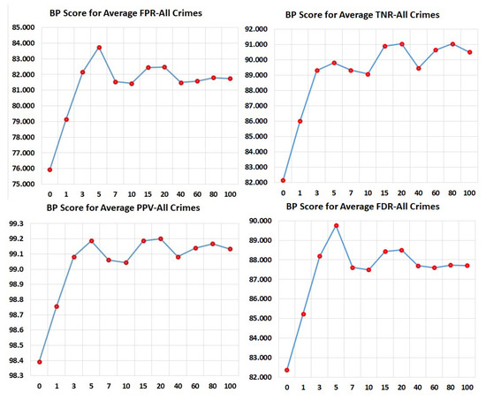 The results from processing the raw data without a prior history, even in the absence of race, designates more recidivism labels to non-recidivating African Americans (higher FPR) than to non-recidivating Caucasians (lower FPR). Furthermore, it assigns fewer non-recidivating labels to recidivating African Americans (lower FNR) and more non-recidivating labels to recidivating Caucasians (higher FNR). This trend was reduced as we included a rolling sum of 26 types of individual crimes, substance abuse, and courses and treatments taken during incarceration for 0, 1, 3, 5, 7, 15, 20, 40, 60, 80, and 100 past arrest records. We can determine if a classifier is fair by using the BP Score that compares metric values for the different subpopulations. Only a practitioner can decide whether having a given BP Score, for example 90, for all or a subset of the fairness metrics can be considered fair or the model needs to be improved further. As the quality of data improves and the ethical standards of our society are raised, we assume that society will continue to demand an ever-increasing value of the BP score, until it is close to a near-perfect 100. The BP score can allow a practitioner to identify bias in a model using different statistical measures, where 100 and 0 are the best and the worst values, respectively. In recidivism, high FPR means more non-recidivists will have to languish in jail while a high FNR means that society is at risk, because recidivists are being let out of jail. A parole officer may decide to use BPS for both Accuracy and FPR above 90 and for FNR above 80. On the other hand, a loan officer may use a minimum BPS for false-negative error rate balance (Equal Opportunity) [14,15] for a model to determine the loan worthiness of a client. Any new fairness measures that may evolve after this paper can also use BP Scores to determine the bias embedded in models and choose the one with the highest BPS or the least bias amongst the given models.