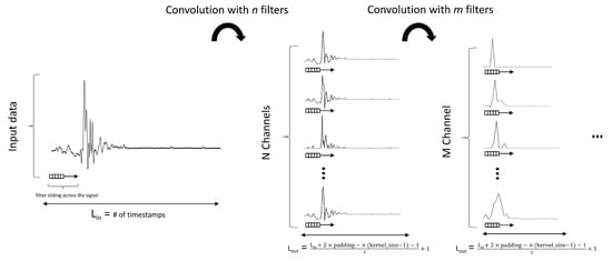 Convolutional neural networks (CNN) were first introduced by Krizhevsky et al. [40] and gained attention by winning the ImageNet challenge [41] with a large margin in 2012. Since then, new CNN Architectures, e.g., ResNet [42] were introduced and enhanced the performance of CNN significantly. CNN’s were mostly used for the image domain. In 2016, Wang et al. [43] introduced a fully convolutional neural network (FCN) architecture to classify time series data. They validated their approach on 44 datasets from the UCR/UEA archive. CNN for time series data processing achieved state of the art performances in various domains e.g., ECG Classification, Sound Classification, and Natural Language Processing. The name giving convolution can be seen as applying and sliding a one-dimensional filter over the time series. Unlike images, the filters cover only one dimension (time) opposed to two dimensions (width and height). A convolutional neural network consists of various filters, ranging from moving average filters to more complex filters. Those filters are learned through the backpropagation algorithm. By passing a univariate time series through a convolutional neural network, multiple convolutions with different filters are applied. This may be seen as using a filter bank to extract useful features, removing outliers or general filtering. To surpass the linear nature of a convolution operation, a nonlinear function is applied after a convolution to introduce nonlinearity and therefore ensure a nonlinear transformation of the time series data. An illustration of a one-dimensional convolutional neural network is denoted in Figure 1. Mathematically, a convolutional neural network apply the following equation for each timestamp t of the time series data :