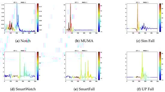 where is the univariate time series for the variable , which is in fact the result of applying the filter and is the weight between the filter (last convolutional layer) and the output neuron of class label c [54]. Examples of class activation maps with a sample for each dataset are depicted in Figure 4. In most cases, the impact region (region with the highest acceleration magnitude) and free fall phase (region right before the impact) are the most contributing parts to the decision-making of our convolutional neural network.
