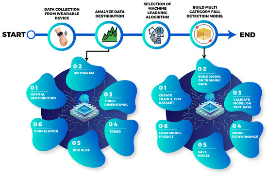(a) Data collection using wearable sensors: This study made use of an experimental dataset that is prepared with linear accelerometer sensors and gyroscope sensors installed in a smartphone, which is collected in real-time mode. Linear accelerometer sensors detected a fall or non-fall, whereas gyroscope sensors measured orientation and angular rotation. It consisted of time period and tri-axis human movement positioning data in addition to fall and non-fall labels. The labels contained information such as backside, forward and side falls (i.e., both left and right), normal walk and running. In total, data was gathered from six subjects, i.e., two subjects (20–25 years), 2 subjects (25–30 years), 1 subject (30–35 years) and 1 subject (60–65 years). The duration of each type of movement for the six subjects was 9–11 s. Data collection rate of the sensors was 419 Hz. For the five labels, each subject performed the aforementioned activities once. The classes were tested with different techniques. Moreover, it was determined that location data differed over time and was close to 0 in the event of a fall [10].