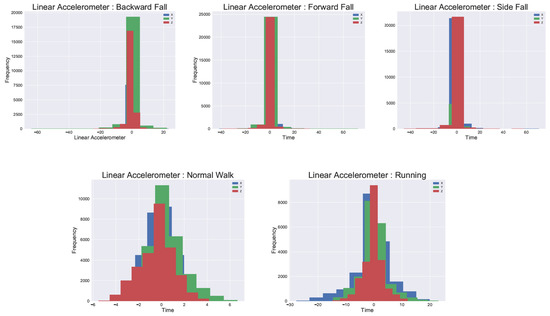 Figure 3 shows a normal distribution in case of a fall. Sharp peaks at 0 can be observed, which indicate the nature of a fall. From the figure, it is evident that data tends to follow a normal distribution in case of a non-fall. For each class, data frequency in case of a fall and non-fall was checked, which was assessed via a histogram plot shown in Figure 4.