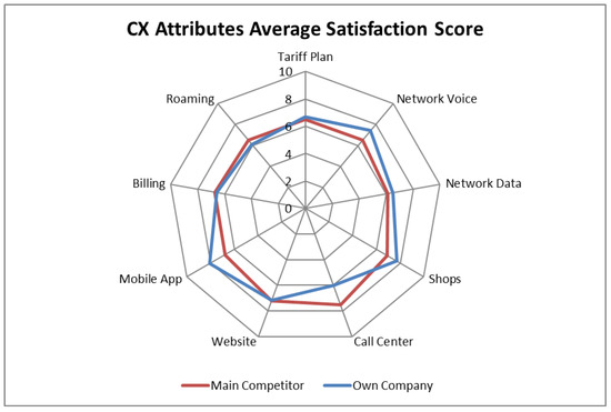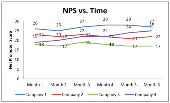 The cornerstone of a CX strategy implementation program is the metric used to measure the performance of both the company and its market competitors. The Net Promoter Score (NPS) [5] is a metric that, according to some studies, is associated with customer loyalty [5,6] and is widely used across industries as confirmed by CX professionals, without missing some objections on this metric as is described in Section 2. The NPS is measured through regular market research surveys, which are conducted at a frequency ranging from monthly to an annual basis. In such a survey, NPS is derived based on a question in which customers are asked to rate the likelihood of recommending the company’s products and/or services to their friends or colleagues. Apart from the NPS question, such a survey also includes questions related to the customer satisfaction score on experience attributes, i.e., key areas of the interaction between the customer and the company that may influence the NPS (e.g., product attributes, like tariff plan, service quality, billing and touchpoint experiences, such as website, call center, mobile app). Moreover, the common practice in CX surveys is to include responses from a sample of customers related to all competing companies in the market, thus giving crucial information about the company’s position against competition.