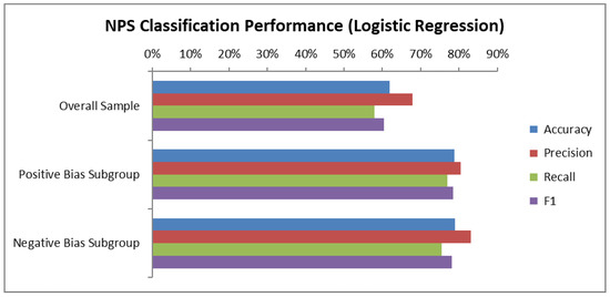 As it can be observed in Figure 4, positively and negatively biased subgroups exhibit Accuracy and F1-score in the range of 70–80%, substantially higher compared to the respective values for NPS analysis without bias classification (in the order of 60%).