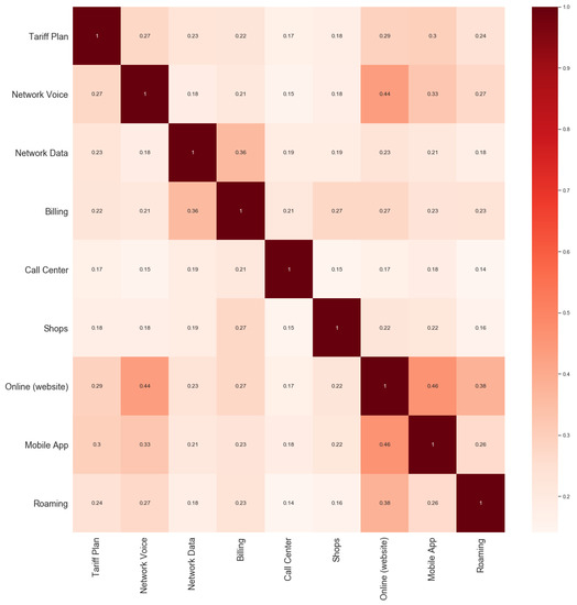 The results of this analysis are presented in Figure 4 where the performance metrics (Accuracy and F1-score) are compared for the NPS analysis without the bias classification and the performance achieved for the subgroups defined based on NPS bias (i.e., positively and negatively biased). The presented results correspond to the average metric score achieved based on the 24 monthly NPS survey data samples. The Variance Inflation Factor (VIF) results indicated no significant issue of multicollinearity. Figure 5 provides the correlation coefficients between the adopted attributes. Moreover, to ensure that the observed results are not an effect of overfitting, the analysis was performed in three-month rolling samples where 20% of the samples were reserved for cross-validation of the regression model.