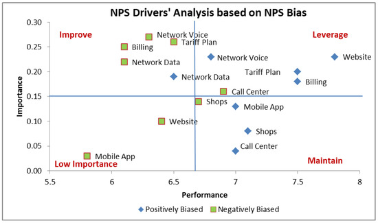 The NPS key drivers’ analysis is typically based on statistical regression models [6,7,36,37,38,39] applied to the relevant customer survey data. Such models consider NPS as the dependent variable and the customer satisfaction scores on the CX attributes as the independent variables. Figure 3 provides an example presentation of the resulting NPS key drivers’ analysis where x-axis “Performance” corresponds to the average satisfaction score of each attribute and y-axis “Importance” corresponds to the regression model coefficient of each attribute or depending on the approach followed an appropriate importance indicator (e.g., Shapley value method [40]). The representation of Figure 3 is commonly used for business decision making [41,42,43,44,45]. As it can be seen from the example of Figure 3 it is feasible for a company to decide on the type of action to follow for each CX attribute depending on the quadrant it belongs to: (a) improve, (b) leverage (i.e., exploit as a competitive advantage), (c) maintain or (d) not important for action (monitor). In the example of Figure 3 it is evident that the attributes that require improvement for the specific company refer to: network voice, network data, tariff and billing.