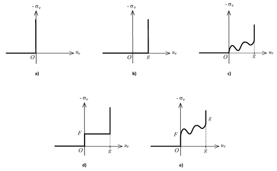 Comments on the contact conditions (1), (2), (7), (9), and (11). First, these conditions are expressed in terms of unilateral constraints and are governed by the data , and F. Moreover, all of them are described by multivalued relations between the normal displacement and the compressive normal stress, see Figure 2. In addition, there exists a hierarchy among these contact conditions as follows: