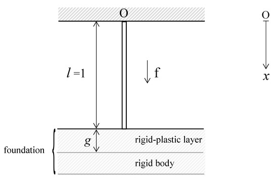 We have and , which shows that the rod is in contact with the foundation, just touching it, and the reaction of the foundation is towards the rod. Nevertheless, there is no penetration, since the magnitude of the stress at is under the yield limit F and, therefore, the rigid-plastic layer behaves like a rigid layer. This case is depicted in Figure 4b.