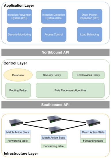 Software-Defined Networking (SDN) is a new paradigm that solves the issues existing in traditional Internet architectures. It provides flexibility in management by making the networking programmable from a logically centralized control point. SDN decouples the control plane from the data plane present in traditional networks and deploys it in a remote device called the controller or control layer, as shown in Figure 1. It comes with the benefits of the centralized control functionalities, applications running on the network operating system, the unique capture of the global view of the architecture, the public interface of the north and south bounds, and its dynamic programmability in forwarding packets. Devices in the data plane, such as switches, forward the packets according to the control decisions or rules sent from the controller. The controller communicates with the application layer through the northbound application programming interface (API) and communicates with the data plane through the southbound API. Controller–switch communication is carried out using the OpenFlow protocol [].