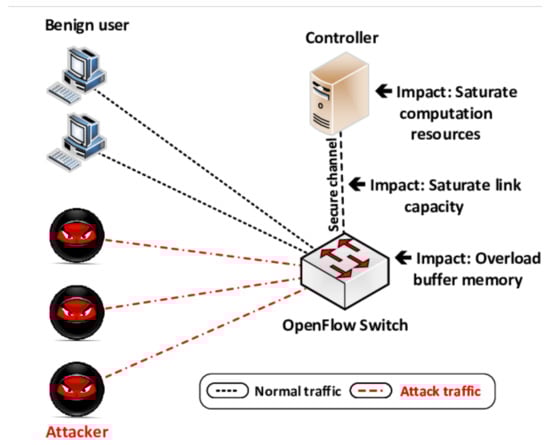 Major security problems in the SDN are issues of unauthorized controller access (intrusion), man-in-the-middle attack, and a flow rule change that modifies packets. Other pertinent issues are malicious packets hijacking the controller, denial of service by switch–controller communication flood, and configuration problems. Distributed denial of service (DDoS) is one the most common and dreadful threats that are aimed at successfully disrupting regular traffic from arriving at the controller. The attack is achieved by flooding the controller with more malicious packets than it can accommodate, thus rendering it inoperable. The attack is made possible by making use of multiple compromised switches (bot) for the production of malicious packets. The attacker forms a botnet, a group of bots, from the switches connected to the controller and then gains control over the entire network to operate after rendering the controller inoperable, as depicted in Figure 2.