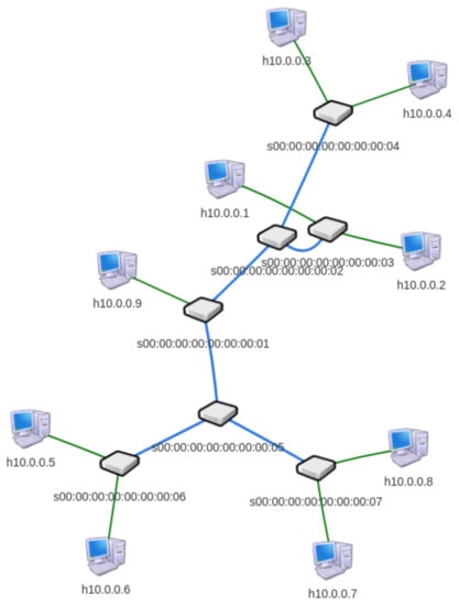The work was simulated using Mininet and floodlight as an external controller. The SDN Mininet simulator software was used in creating the three-tier data center topology (shown in Figure 3). The floodlight controller and OpenFlow switches were deployed using a virtual machine running Ubuntu. After setting up the network, a specialized tool known as hping3 [] was used to generate data traffic. Using the hping3 tool, we simulated a normal TCP, UDP, and ICMP traffic between two endpoints in the network. Afterwards, we simulated a DoS for TCP, UDP, and ICMP flood attacks. The statistics of the various switches were collected; these include: