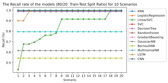 A comparison of the recall of the models for a 80/20 train–test split ratio.