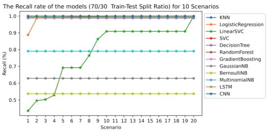 A comparison of the recall of the models for an 70/30 train–test split ratio.