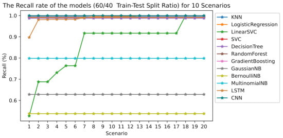 A comparison of the recall of the models for a 60/40 train–test split ratio.