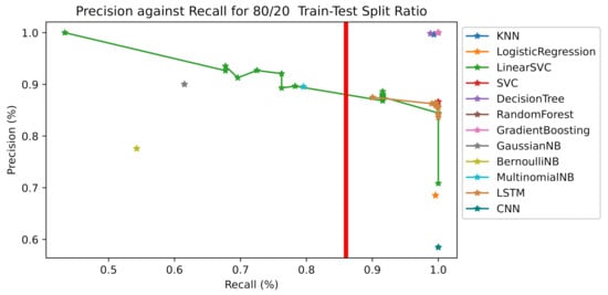 A comparative analysis of the precision and recall of each model using an 80/20 train–test split ratio.
