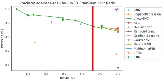 A comparative analysis of the precision and recall of each model using a 70/30 train–test split ratio.