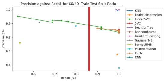 A comparative analysis of the precision and recall of each model using a 60/40 train–test split ratio.