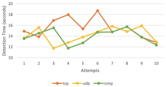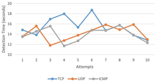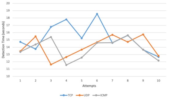 In Figure 15, the highest time it took the LSTM model to detect TCP DDoS flood among the 10 attempts was 18.70 s and the least time was 12.83 s. It took 11.73 and 15.90 s, respectively, as the lowest and highest times to detect the UDP DDoS flood attack. In addition, it took 11.76 and 15.73 s, respectively, as the lowest and highest times to detect ICMP flood attack among the 10 scenarios considered.