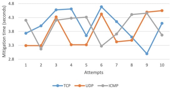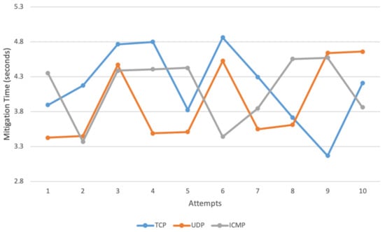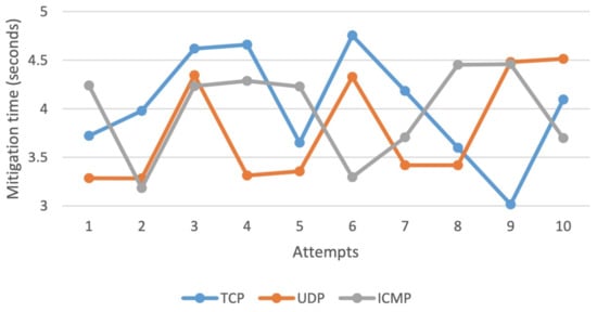 In Figure 20, the highest time it took the LSTM model to mitigate the TCP flood attack was 4.86 s and the least time was 3.16 s. It took 3.42 and 4.65 s, respectively, as the lowest and highest times to mitigate the UDP flood attack. In addition, it took 3.36 and 4.57 s, respectively, as the lowest and highest times to mitigate the ICMP flood attack.