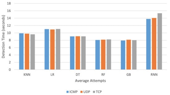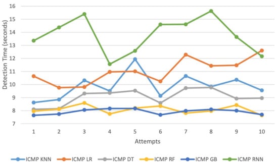 In Figure 17, the highest time it took the LSTM model to detect the TCP flood was 18.55 s and the least time was 12.67 s. It took 11.62 and 15.70 s, respectively, as the lowest and highest times to detect the UDP flood attack. In addition, it took 11.56 and 15.63 s, respectively, as the lowest and highest times to detect the ICMP flood attack.