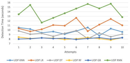 In Figure 16, the highest time it took the LSTM model to detect the TCP flood among the 10 scenarios was 18.71 s and the least time was 12.84 s. It took 11.81 and 15.89 s, respectively, as the lowest and highest times to detect UDP flood attack. In addition, it took 11.68 and 15.76 s, respectively, as the lowest and highest times to detect ICMP flood attack.