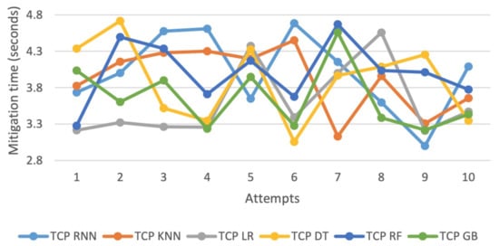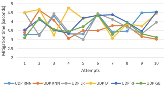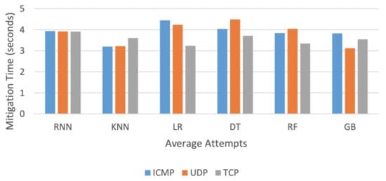 In Figure 19, the highest time it took the LSTM model to mitigate the TCP flood attack was 4.68 s and the least time was 2.99 s. It took 3.28 and 4.54 s, respectively, as the lowest and highest times to mitigate the UDP flood attack. In addition, it took 3.16 and 4.45 s, respectively, as the lowest and highest times to mitigate the ICMP flood attack.