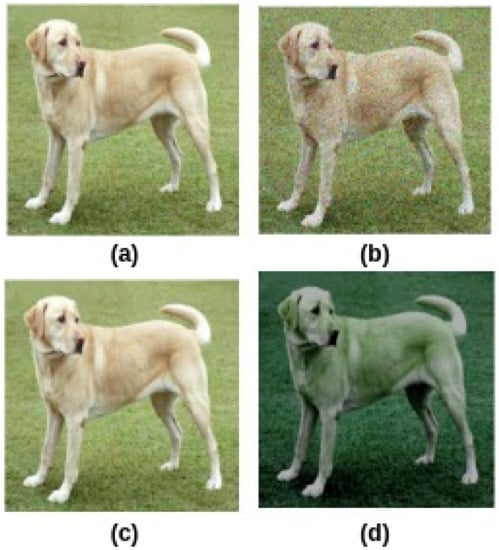 Color Transformation as pretext task [15]. (a) Original. (b) Gaussian noise. (c) Gaussian blur. (d) Color distortion (Jitter).