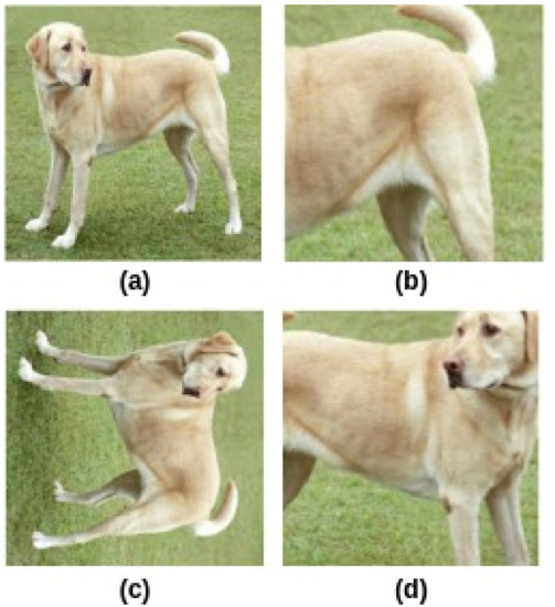 Geometric transformation as pretext task [15]. (a) Original. (b) Crop and resize. (c) Rotate (90, 180, 270). (d) Crop, resize, and flip.