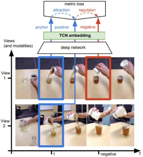 - Sermanet, P.; Lynch, C.; Chebotar, Y.; Hsu, J.; Jang, E.; Schaal, S.; Levine, S.; Brain, G. Time-contrastive networks: Self-supervised learning from video. In Proceedings of the 2018 IEEE International Conference on Robotics and Automation (ICRA), Brisbane, Australia, 21–25 May 2018; pp. 1134–1141. [Google Scholar]