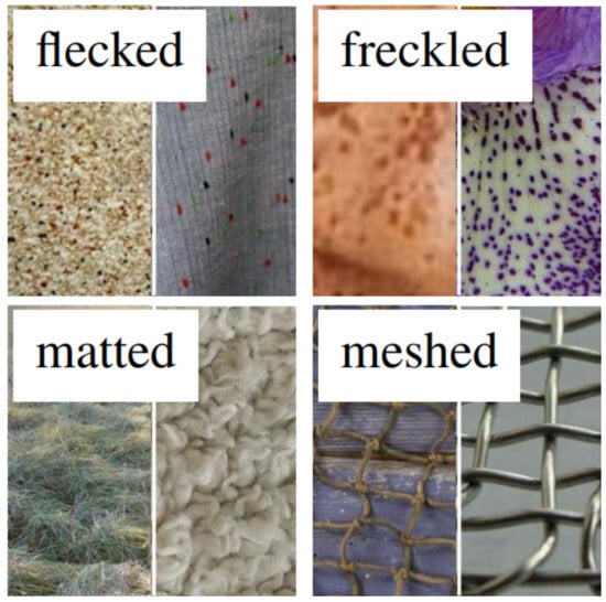 - Cimpoi, M.; Maji, S.; Kokkinos, I.; Mohamed, S.; Vedaldi, A. Describing textures in the wild. In Proceedings of the IEEE Conference on Computer Vision and Pattern Recognition, Columbus, OH, USA, 23–28 June 2014; pp. 3606–3613. [Google Scholar]