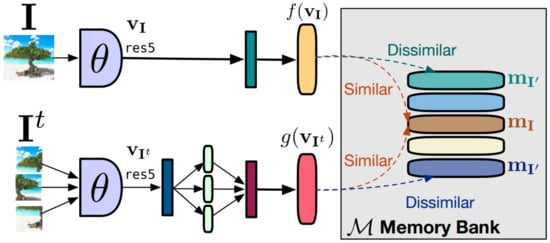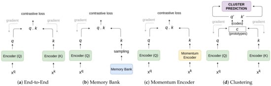 - He, K.; Fan, H.; Wu, Y.; Xie, S.; Girshick, R. Momentum contrast for unsupervised visual representation learning. In Proceedings of the IEEE/CVF Conference on Computer Vision and Pattern Recognition, Seattle, WA, USA, 13–19 June 2020; pp. 9729–9738. [Google Scholar]